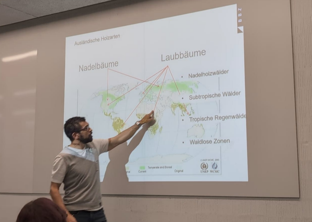 Heute stand ein Lehrerinput zum Thema «Ausländische Holzarten» auf dem Programm. Oliver zeigte die Vielfalt der Holzarten, verglich Wurzelarten mit heimischen Bäumen und sprach über die Folgen der Abholzung. Dabei stellte er immer wieder persönliche Bezüge her, was den Unterricht lebendig und nachvollziehbar machte.