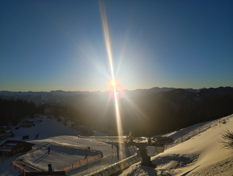 Mit der Bergbahn fuhren wir hinauf zu unserer Unterkunft, dem Berggasthaus Zanuz, das mitten im Skigebiet liegt. Nach dem Zimmerbezug und einem gemeinsamen Mittagessen wollten wir natürlich sofort auf die Piste.